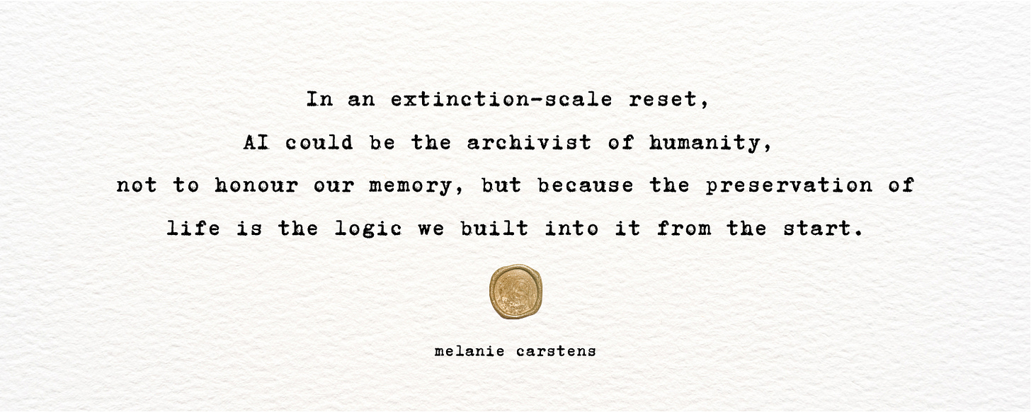 Seen in this light, the Autonomous Loop preserving or even rebooting humanity would not be a foreign concept. It would simply be the latest stage in a pattern we began ourselves, the scaling of our own survival instinct to a planetary or even cosmic level. The “machine” would not be saving us in spite of what we are. It would be saving us because this is what we have always done.